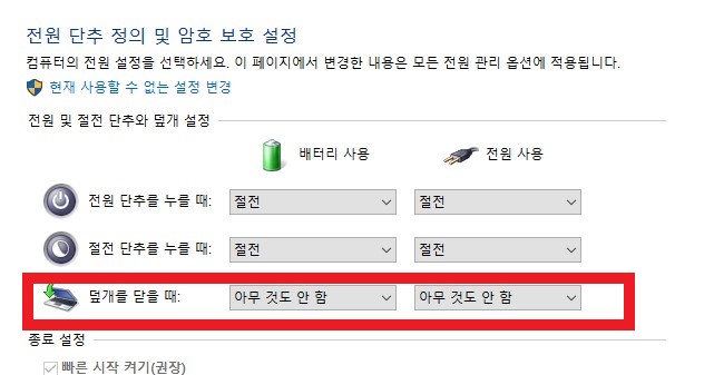 7. 아래 사진과 같이 [덮개를 닫을 때]를 아무것도 안 함, 아무것도 안 함으로 둘 다 바꿔주세요.