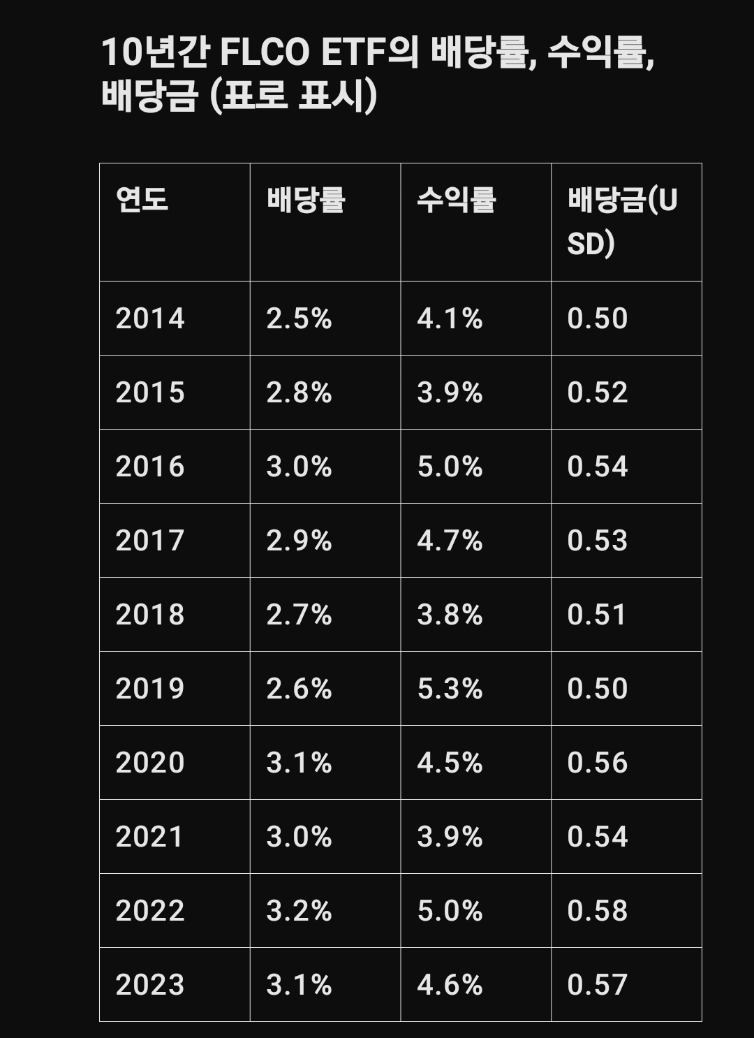 채권을 통해 발생하는 이자 수익은 FLCO ETF의 배당금으로 지급돼요. 이 상품은 채권에 대한 노출을 통해 안정적인 현금 흐름을 원하는 투자자에게 적합한 선택입니다.