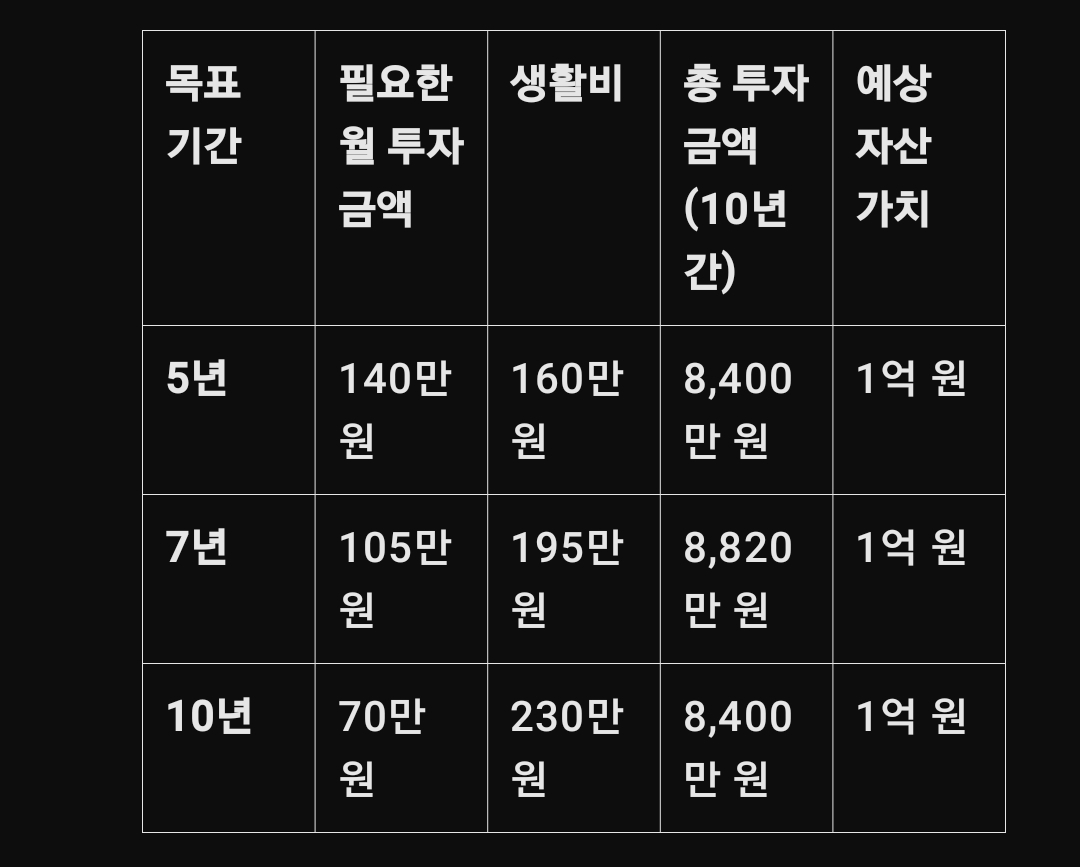 연평균 7% 수익률을 가정하면, 10년 동안 1억 원을 모으기 위해 매달 약 70만 원을 투자해야 합니다.
