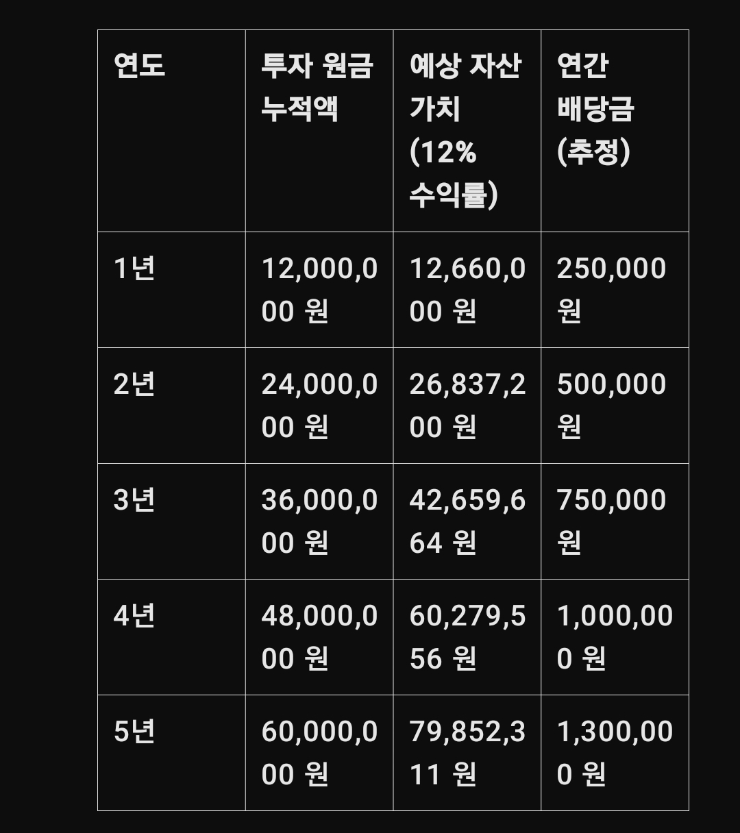 이 시나리오를 통해 5년 동안 꾸준히 투자했을 때의 자산 성장을 계산하면, 복리 효과와 함께 자산이 어떻게 증식될 수 있는지 알 수 있습니다.