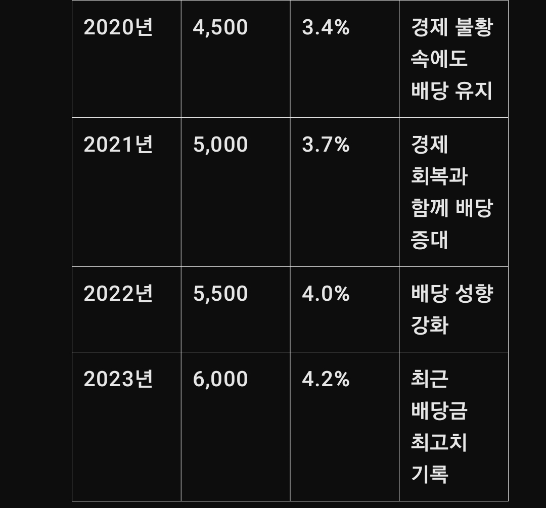 현대차는 지난 10년 동안 꾸준히 배당금을 증가시키며 주주들에게 안정적인 수익을 제공해 왔습니다. 경제 상황이나 회사 실적에 따라 배당금은 변동할 수 있으나, 현대차는 배당 성향을 높이며 장기 투자자들에게 매력적인 수익을 제공합니다.