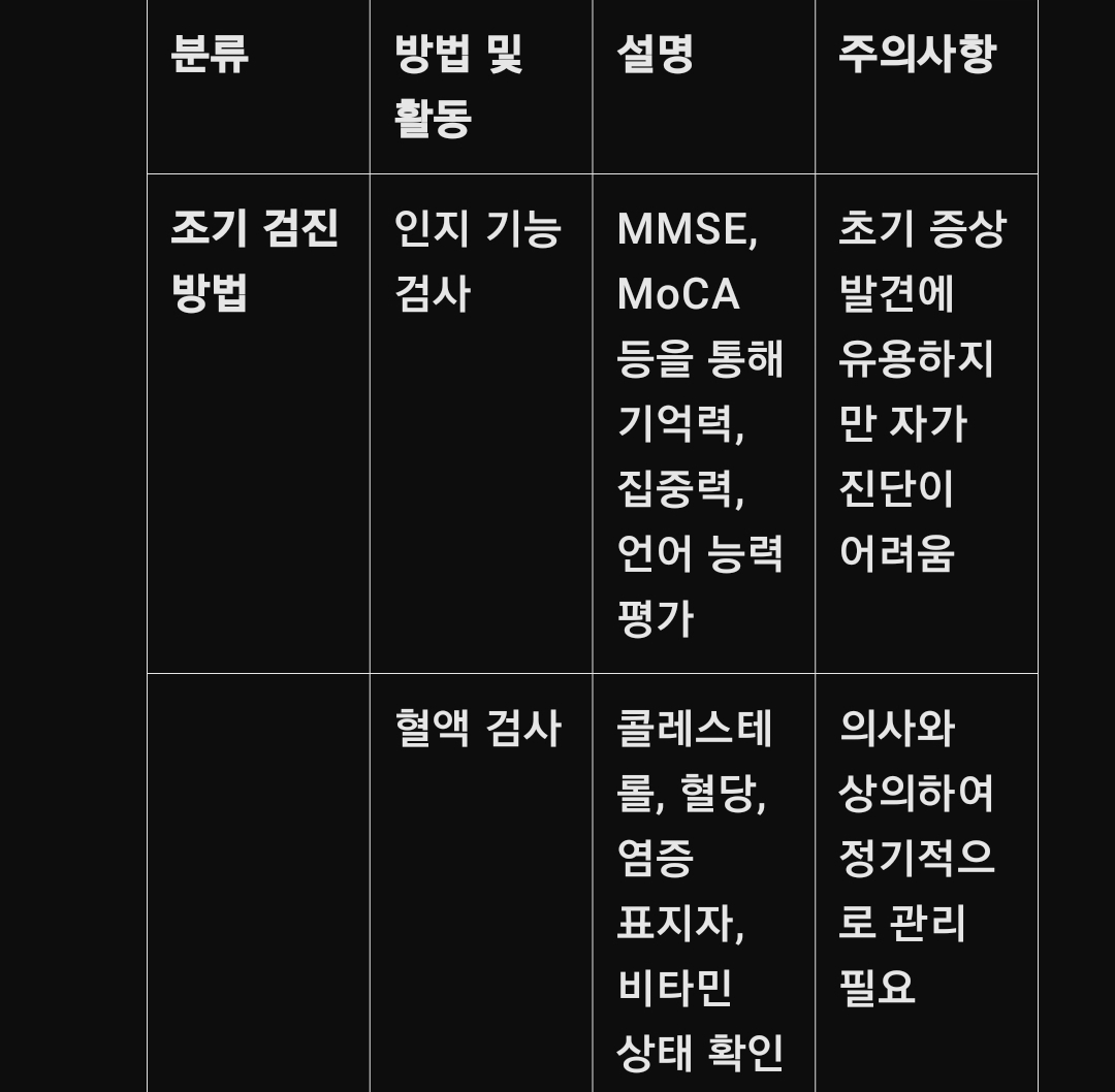 비타민 및 영양 상태 검사: 비타민 B12나 엽산이 결핍되면 인지 기능 저하가 발생할 수 있으므로, 비타민 결핍 여부를 조기에 확인하여 보충하는 것이 좋습니다.