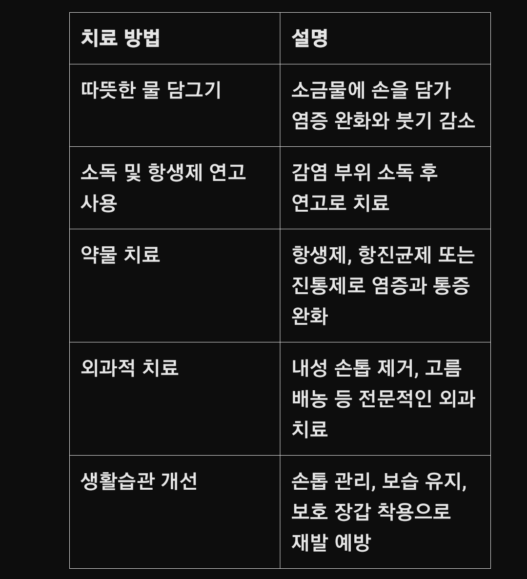 손톱을 너무 짧게 깎거나 비정상적으로 손톱이 자라날 때 발생.